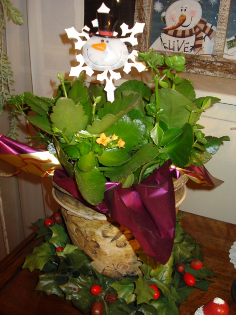 Even Frosty the Snowman is smiling as it looks over the pretty plant.
